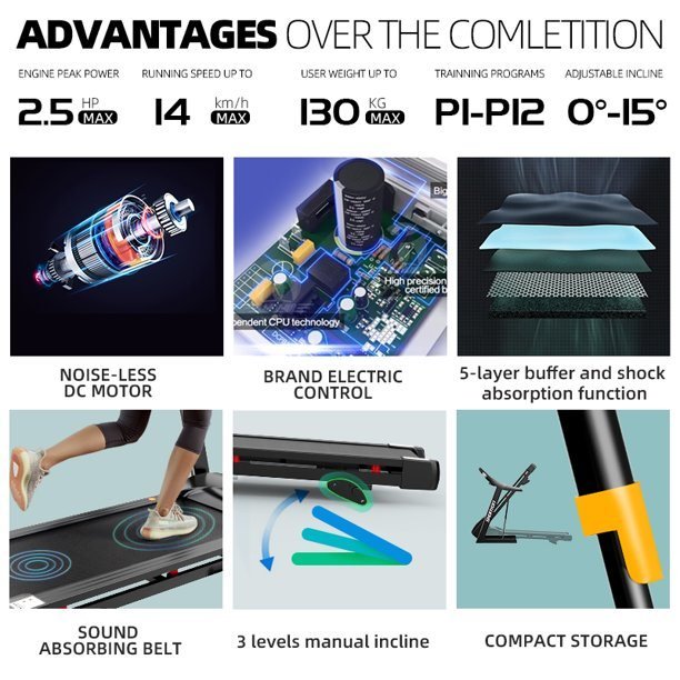 • Foldable design & Cushioning Design: Easy folding mechanism and a soft drop system to help you fold and unfold your treadmill safely and with ease.