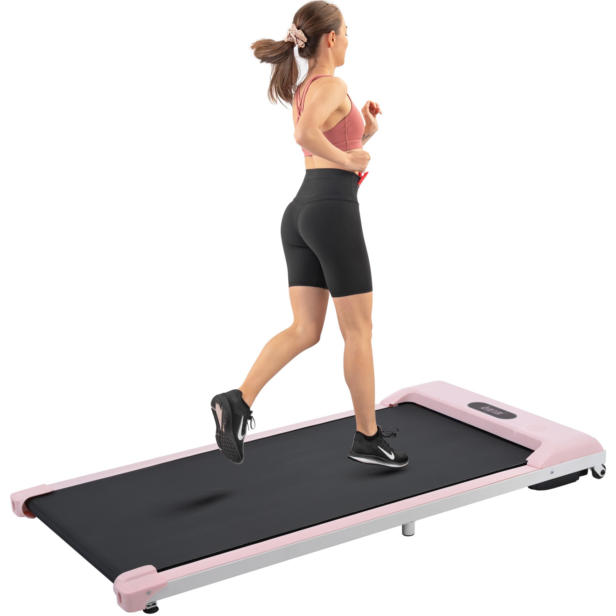 2 in 1 Under Desk Treadmill. The independent remote control can efficiently control and adjust the running speed and improve the running safety. Available in 0.5 to 4 MPH Speed levels, this walking treadmill allow you to select different speed base on your physical condition and exercise based. Maximum weight: 260lbs.With a 2.5 HP powerful quiet Motor,the electric treadmill is perfect for running, jogging, and walking in the comfort of your home. With a durable steel frame and multi-layer shield design, the under desk treadmill's shock-absorbing and noise-reducing, making your running quieter, safer and more comfortable.The LED display clearly shows time, calories, step, speed and distance, monitoring your progress in real time and keeping your movement data at a glance. Connect the treadmill to your phone through Bluetooth, so you can play music while you are exercising.No Assemble & Space-saving: Unlike the traditional treadmills, our walking and running 2 in 1 treadmill is no assemble needed, designed to be lightweight, portable and easy to store under the bed or desk. Wheels at the bottom are for easy transportation.39.37"x 14.96" Widened Running Belt Making running or walking on this treadmill more freely. 5 layers non-slip running belt and Silica gel column support will greatly absorb shock to provide cushioning for knee, muscle and joints.