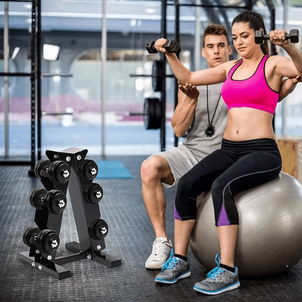 Home > A-Frame Dumbbell Rack Stand Compact 3 Tier Free Weight Steel Dumbbell Storage Bracket for Home Gym (Black) - KM3541