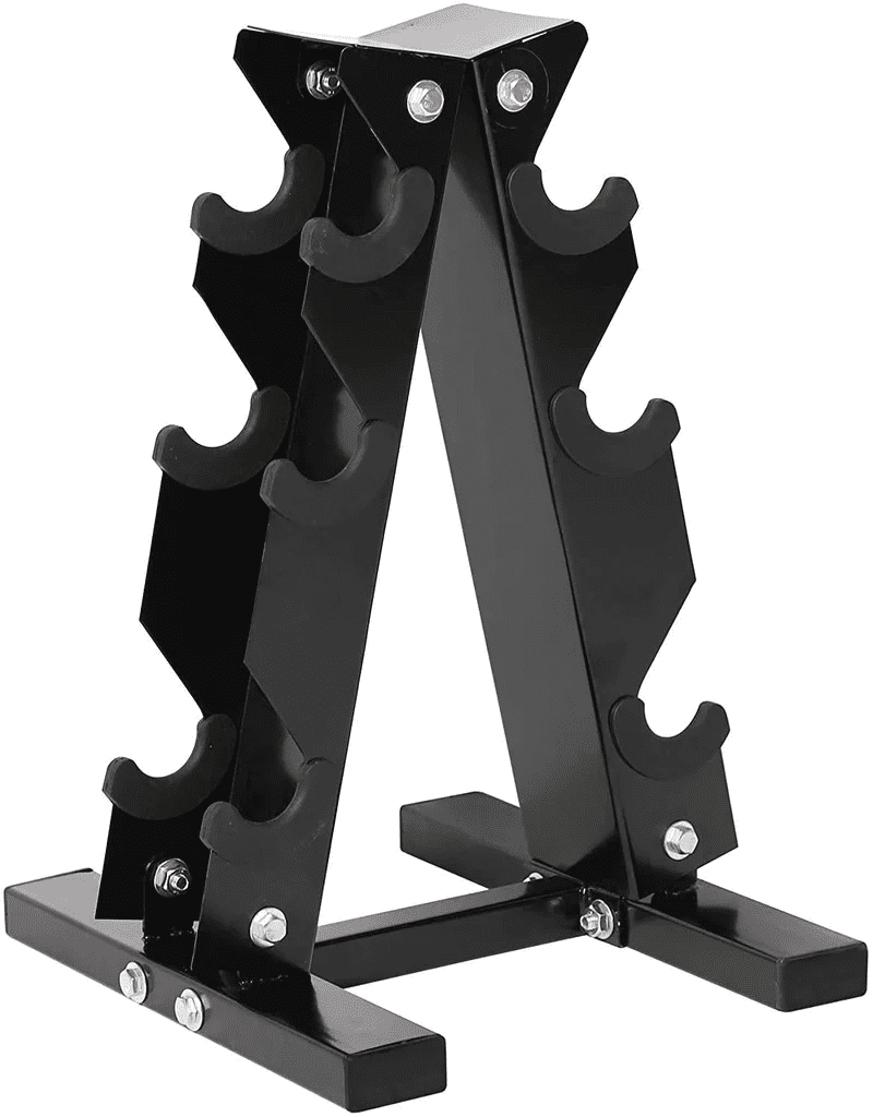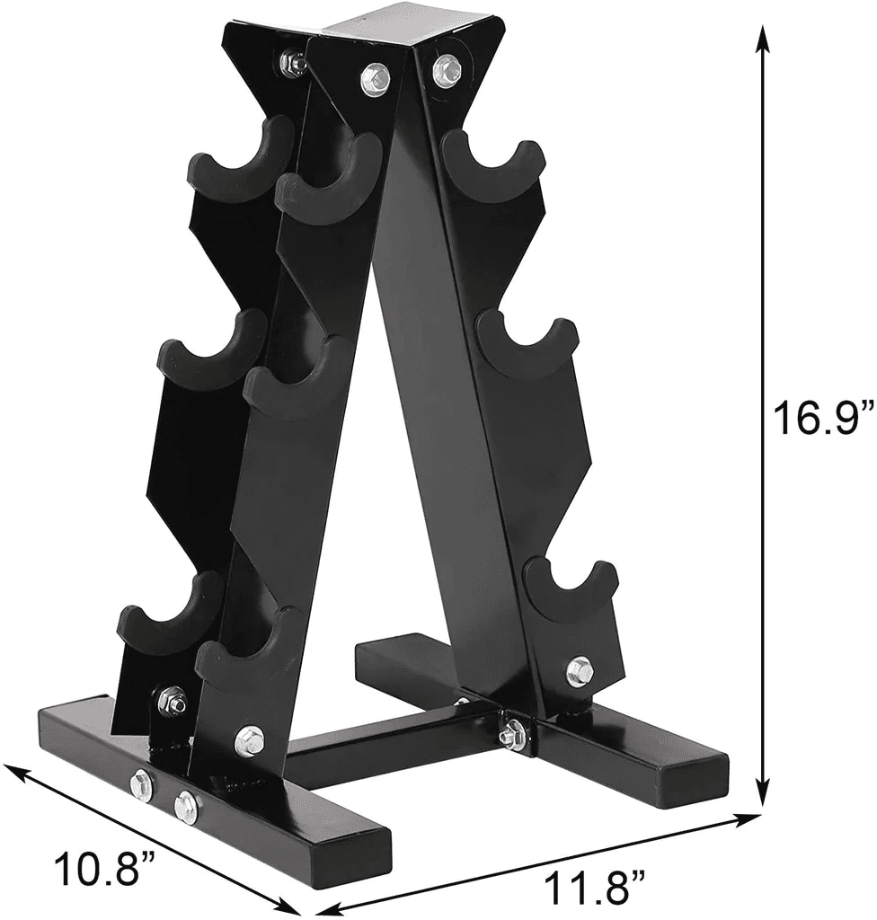 Materials | Made of heavy-duty steel and finished with black powder coat for long-lasting performance, sturdy, and stability. Compact | Vertical A-frame design of this rack allows you easily access and store dumbbells, Suitable for a home gym. Protection | Each storage rack has a rubber pad that could prevent scratching and protect the dumbbell. Weight Limit | This dumbbell rack can hold up to 120 lbs, and can adapt to dumbbells of different sizes and weights.