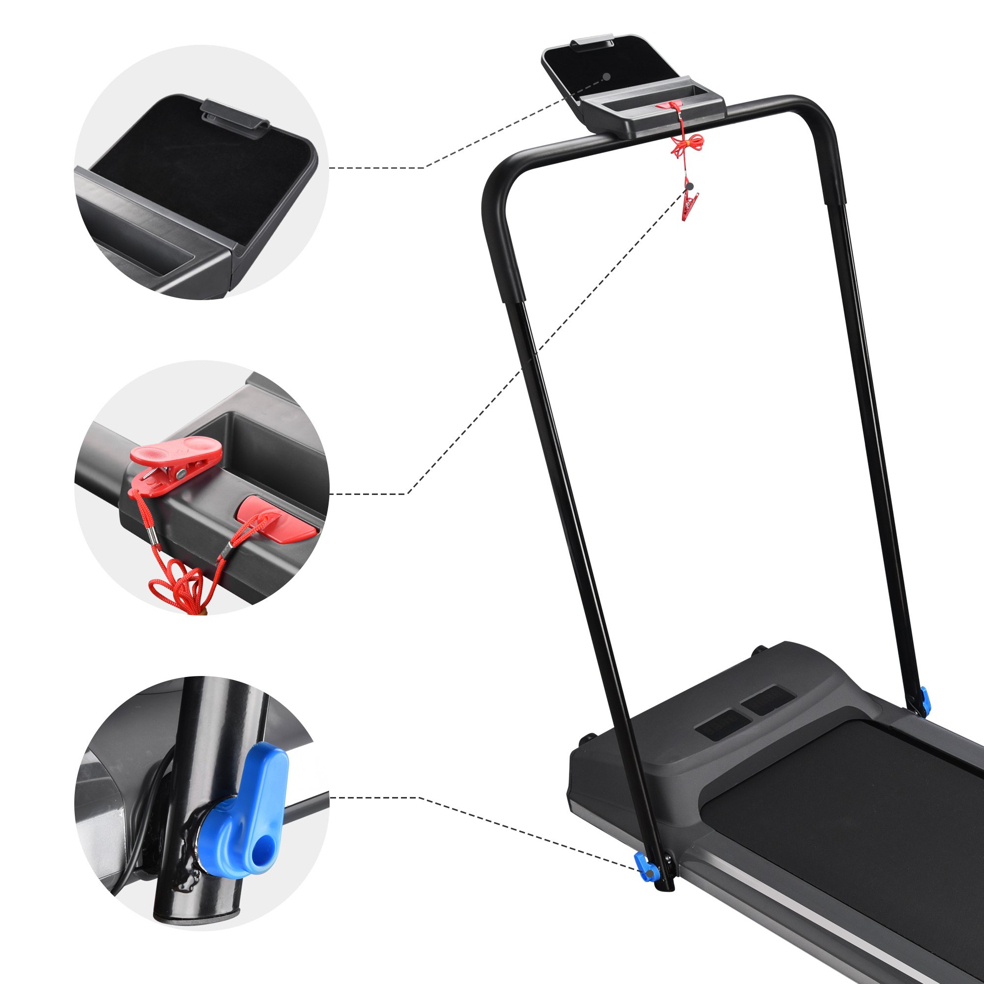 Convenient & Safe Design - features phone slot & adjustable Pad holder for keeping your phone or pad at hand for chatting; enjoying music or videos while exercising; making your training relaxing & joyful; Safety Key for emergency stop of the running belt to avoid accidents