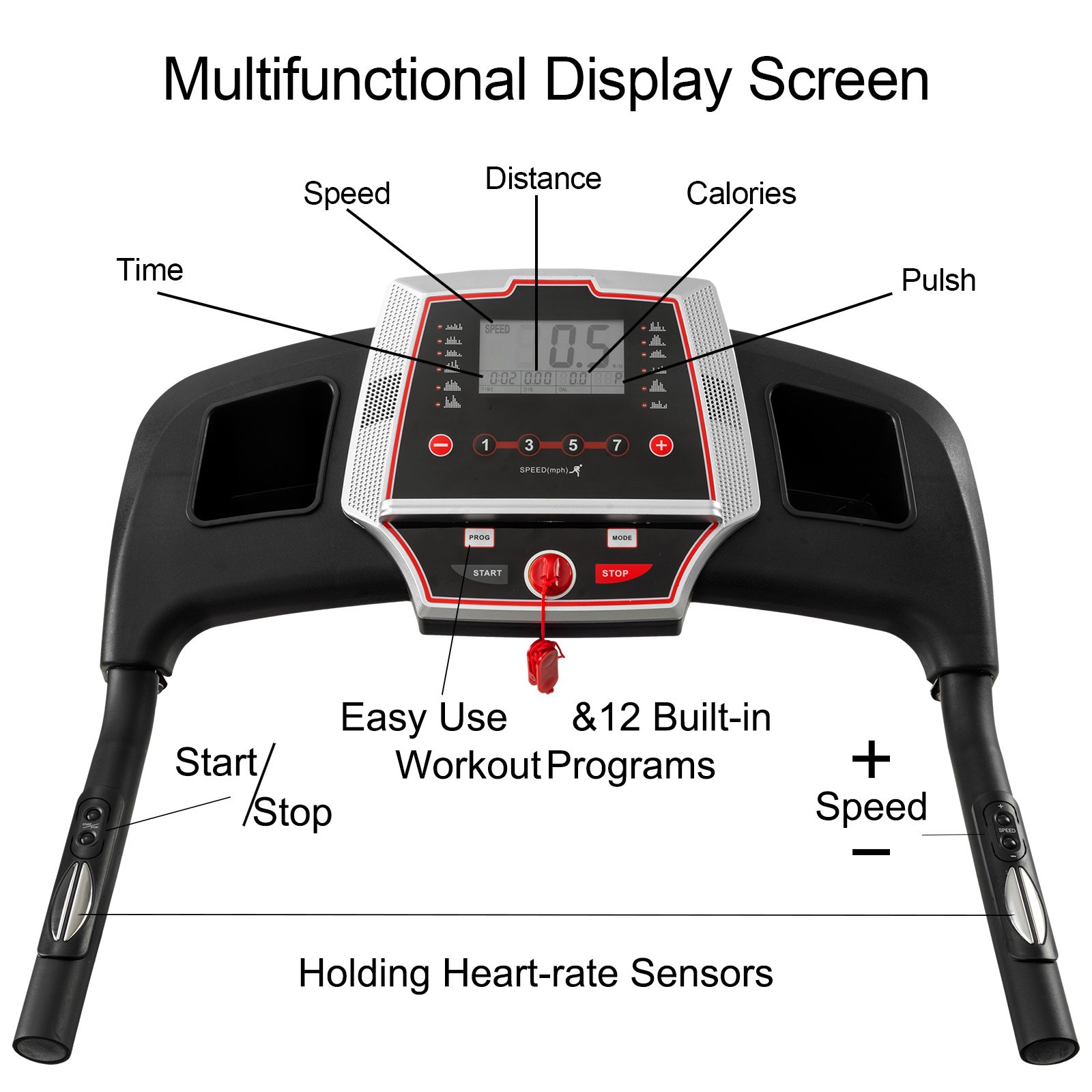• HEAVY DUTY FRAME TREADMILL - Folding treadmill is constructed of premium stainless steel, which makes the treadmill machine body durable and capable of heavy load-bearing (Maximum 300lbs). This folding treadmill for running equipped with a 3.5HP silent motor, you can choose the desired exercise speed from 0.5-8.5MPH(12KM/H). You can also make your running plan based on three different modes (Run according to Length of time, Length of distance, and Calorie consumption).12 TRAINING PROGRAMS & 3 MANUAL INCLINE - The electric treadmill is equipped with 12 preset training modes. Choose the most suitable program of the running machine according to the amount of exercise needed, and the intensity is fully customizable by adjusting the treadmill speed. The incline treadmill is equipped with adjustable slope angles, and you can easily switch between them by adjusting the base. Ideal for you to run, walk and do aerobic exercises at home. LED DISPLAY & HIGH QUALITY RUNNING AREA - ThIS compact treadmill has a clear LED screen that displays the running distance, running speed, running time, Calorie consumption, and heart rate in real time. A quick glance shows your current state of health. The running belt uses grass-like texture design, which brings anti-skid function and more comfortable running experience. The running area is 41.3"*17" SPACE SAVING & HOLDER - The hydraulic lever allows fold the folding treadmill in a breeze (folding size: 26.4 * 24.8 * 46inches). which is convenient to store and space-saving. The space saver treadmill equipped with transport wheels, so you can move it to any place you want to exercise easily. The treadmill for apartment is also equipped with 2 cup holders and 1 pad holder to help you stay hydrated during / enrich your exercise time.EASY INSTALLATION & EXCELLENT SERVICE - The installation process will be within ten minutes, the instructions contain suggestions for installation, maintenance, and how to exercise.