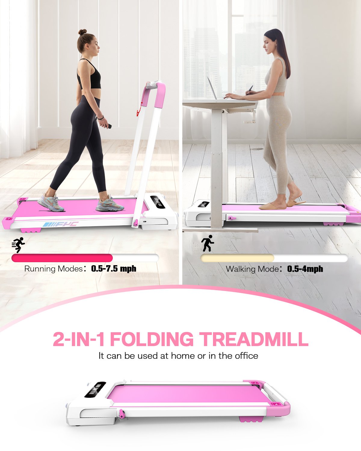 [Innovative 2-in-1 Folding Design] This FYC 2-in-1 folding treadmill offers two exercise modes: under desk walking and running. Fold the handrail for under desk walking at 0.5-4mph, allowing you to work or study while staying active. Raise the handrail for running at 0.5-7.5mph to reach your fitness goals efficiently.