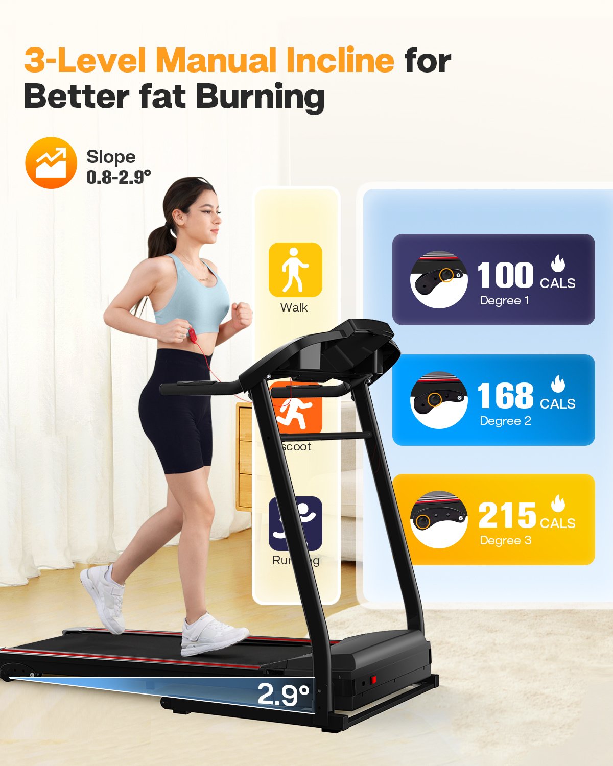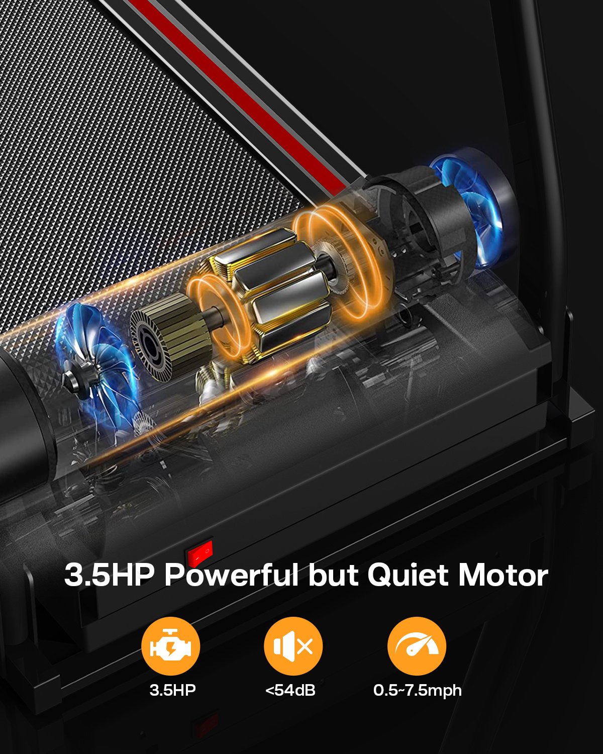 3.3.5 HP Quiet Motor & Spacious Running Belt: This electric treadmill with a 3.5 HP powerful quiet Motor. The large running belt features 47"L x16"W, Wider belt gives your feet a comfortable area and no worry of drifting off the side of the machine when doing exercising.