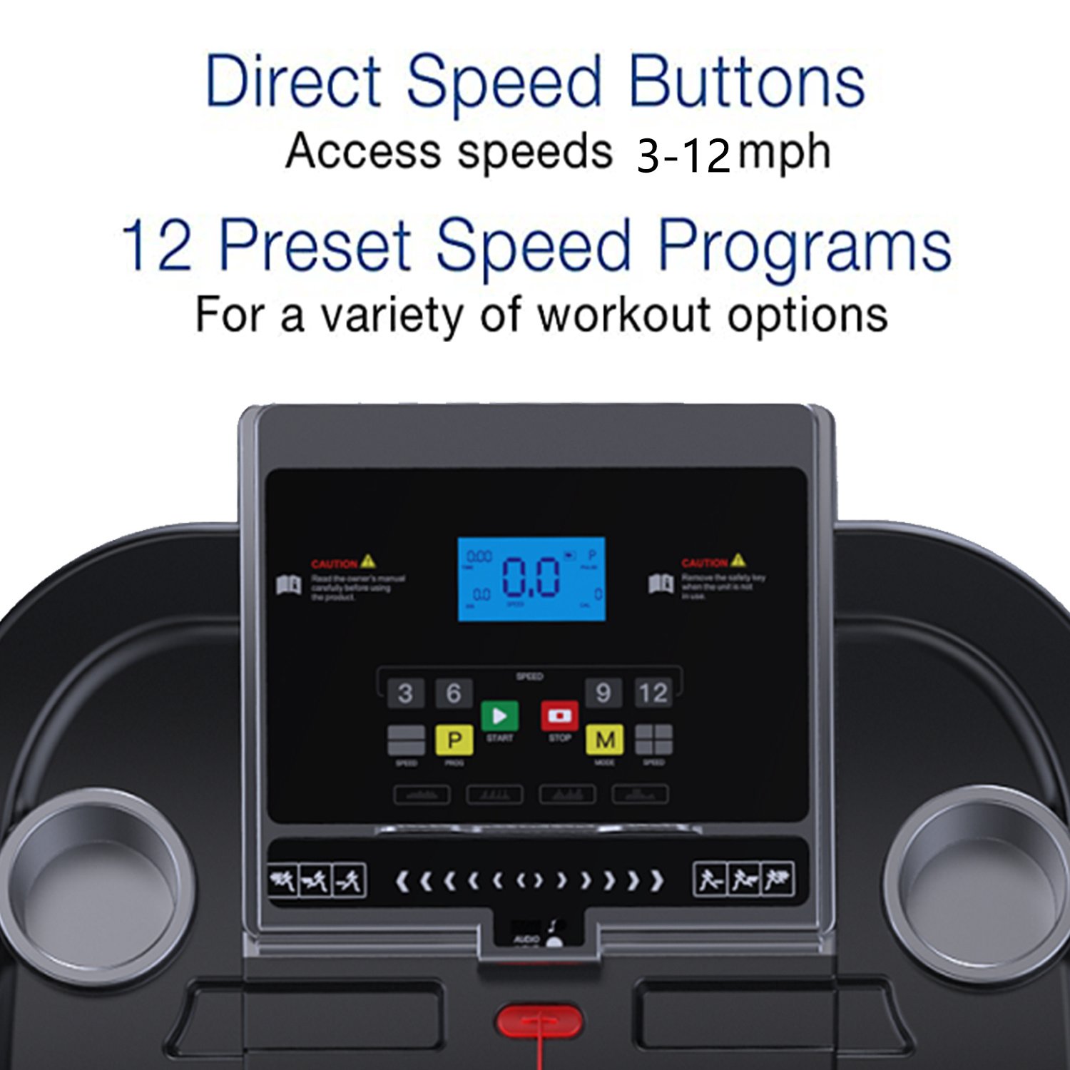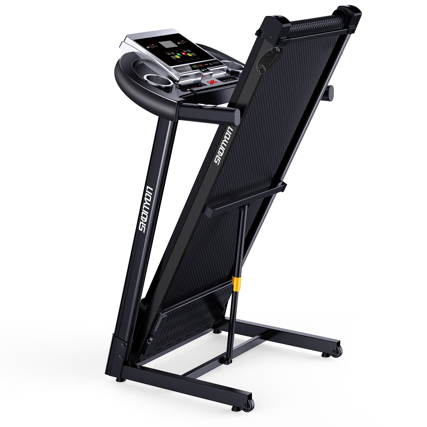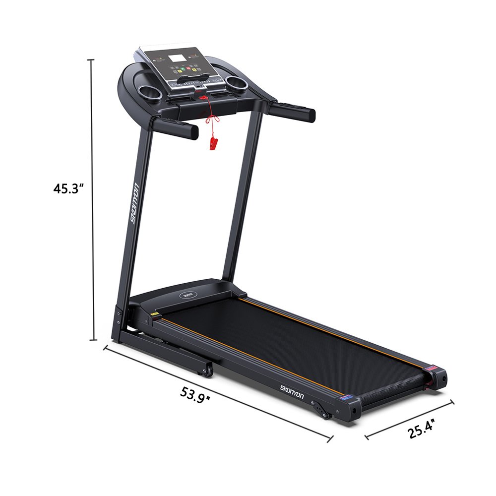 Product detailsEnjoy a quiet workout with a powerful motor perfect for walking; jogging; and running in the comfort of your own home. 12 built-in workout programs to follow on the front-facing LCD screen so you can switch up your workout and challenge your body.Designed to be similar to treadmills you can find at any commercial gym; this treadmill is manufactured with high-grade materials and is equipped with a 2.0 Hp motor supporting up to 220 lbs. Treadmill frame manufactured for user-friendly folding so you can save valuable space; store and transport with ease. Portable design - Easily folds down; and built-in wheels make it even easier to roll it from one room to another so you can get a workout anywhere around the house.Multi-Functional Electric Folding Treadmill for Home Use With Cup Holder Heart Pulse System Low Noise Electric Running Training Fitness Treadmill - Built-in MP3 Speaker; 12 Preset Program:Specifications Power: 2.0 HPRated voltage: 110VSpeed range: 1-12.8 km/hWeight capacity: 220 lbsRunning area: 15.8" x 43.3" Expand size: 53.9" x 25.4" x 45.3"Folding size: 31.3" x 25.4" x 46.7"Packing size: 55.7" x 27.4" x 9" (L x W x H)Package includes - 1 x treadmill