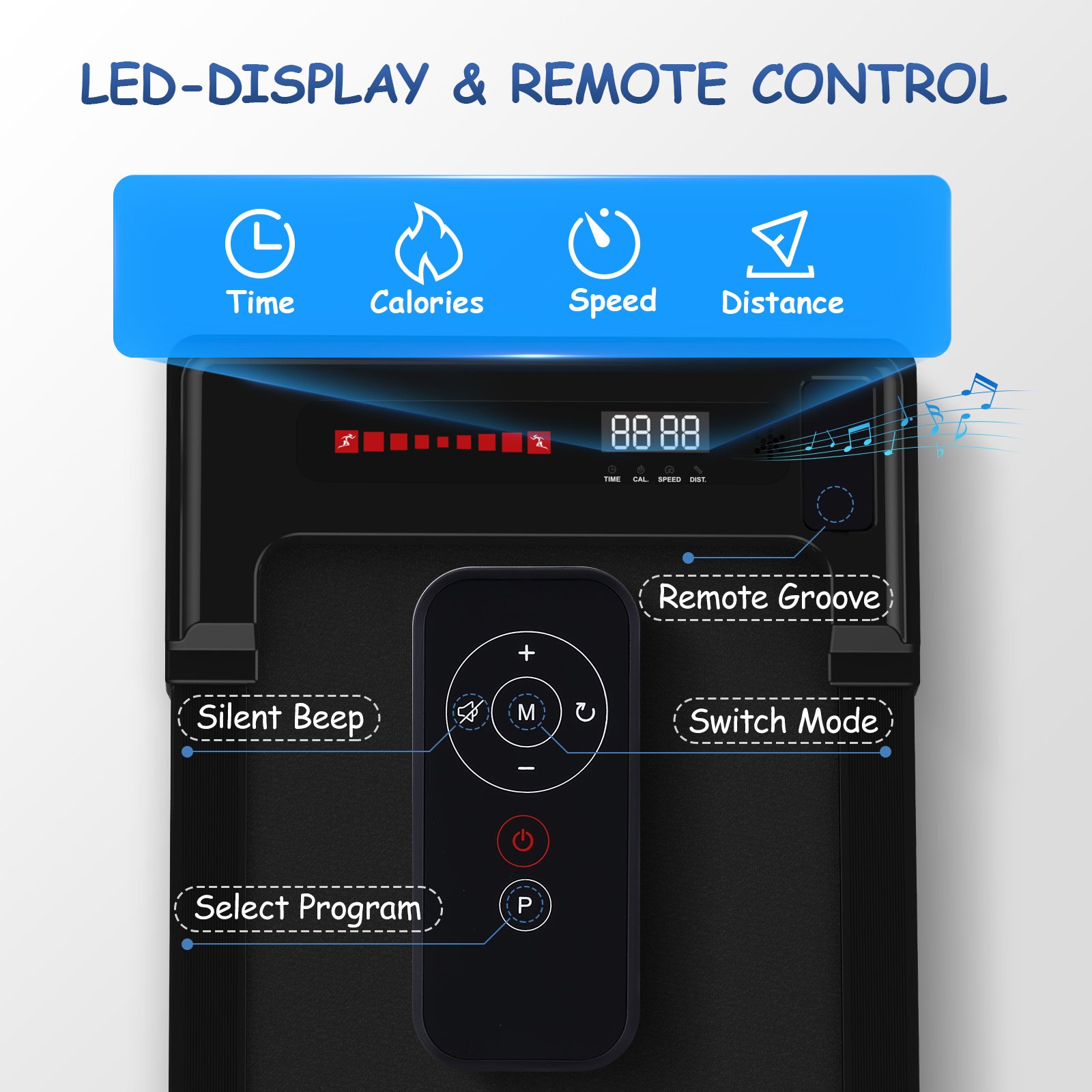 4.The LED Display & Remote Control: This portable treadmill with LED display allows you to track speed, distance, time and calories in real time, The remote control is convenient for you to adjust the speed and modes while running.